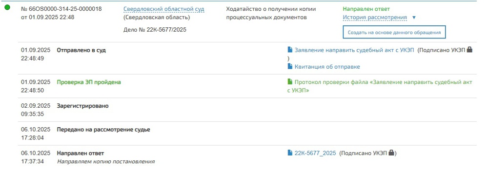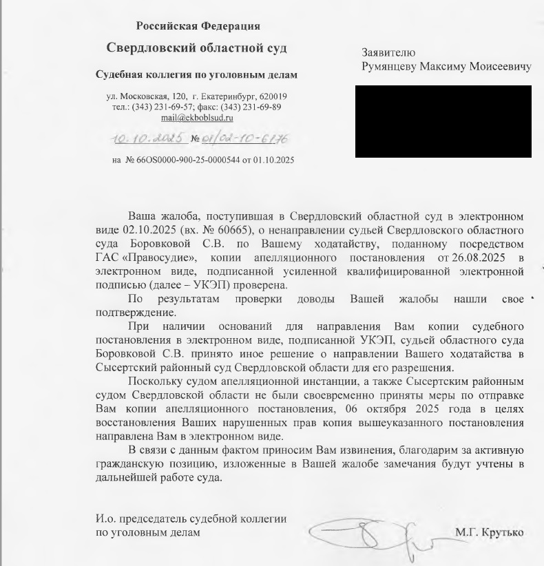 Ответ зампреда ККС Свердловской области Дмитрия Ковелина был диаметрально противоположным: "По информации Свердловского областного суда, 06 октября 2025 года копия указанного Вами судебного акта направлена в Ваш адрес в электронном виде".