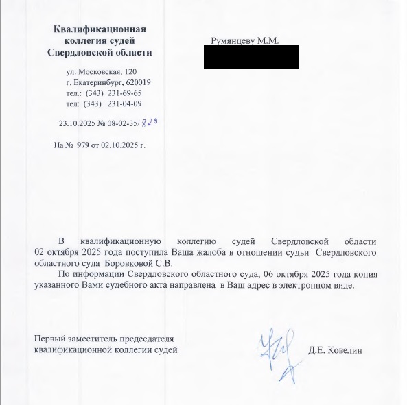 Возвращаясь к теме противоположных ответов двух судей одного и того же Свердловского областного суда, занимающих разные административные посты, следует, что каждый из них поступает по своей совести и проявления этой совести и надлежащего исполнения своих обязанностей судьи в силу Кодекса судейской этики проявляются по-разному. Конечно, ответ зампреда ККС Свердловской области явно нарушает императивную норму ст. 10 Федерального закона от 02.05.2006 № 59-ФЗ (ред. от 28.12.2024) "О порядке рассмотрения обращений граждан Российской Федерации": обращение рассмотрено не всесторонне и не объективно, меры, направленные на восстановление или защиту нарушенных прав, свобод и законных интересов гражданина не приняты, уклонение от обязанности дать ответы по существу поставленных в обращении вопросов. Но зампреда ККС Свердловской области Дмитрия Ковелина за такую отписку вряд ли привлекут к дисциплинарной ответственности.